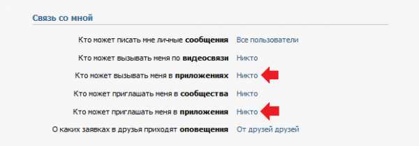 Теперь опустите открытую вами страницу до подраздела «Связь со мной». Здесь вы увидите несколько пунктов. Для пунктов «Кто может вызывать меня в приложениях» и «Кто может приглашать меня в приложения» выберите «Никто», тогда вы перестанете получать уведомления от других пользователей, касаемо игр и приложений.